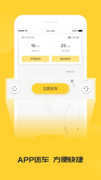 扫码开锁,关锁自动计费,app预约选车,智能导航,续航实时可见。