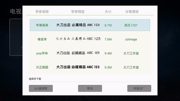 精心挑选多种风格各异的字体,为您的电视美容化妆。开机画面可以更换成您的全家福,婚纱照,感受一家人的温馨。