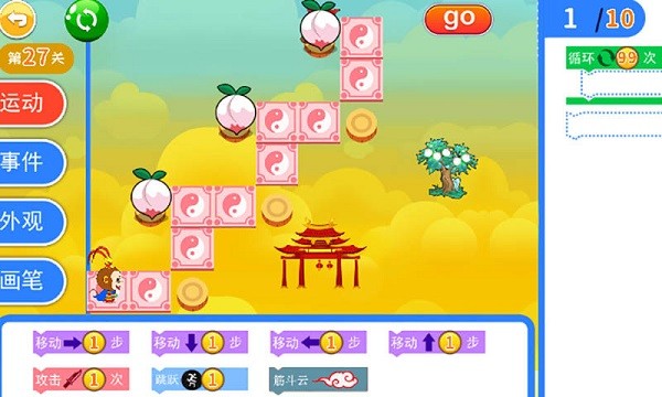 【寓教于乐】通过悟空一行西游取经的故事,通过搭建程序积木块,实现移动、攻击打怪、解救师傅等环节。寓教于乐,轻松学编程。