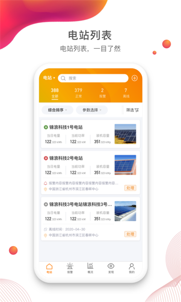 电站管理:多电站列表、电站地图,多维度掌控电站运行状态。