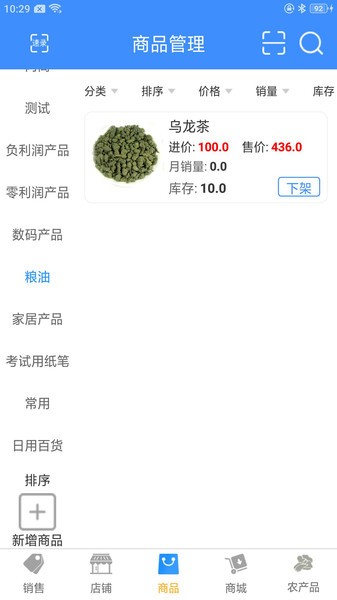 -- 销售统计:通过列表的形式对商品进行【时间,分类,销售额或销售排序】的展示,也可以通过商品名称或条码搜索具体商品的销售情况;