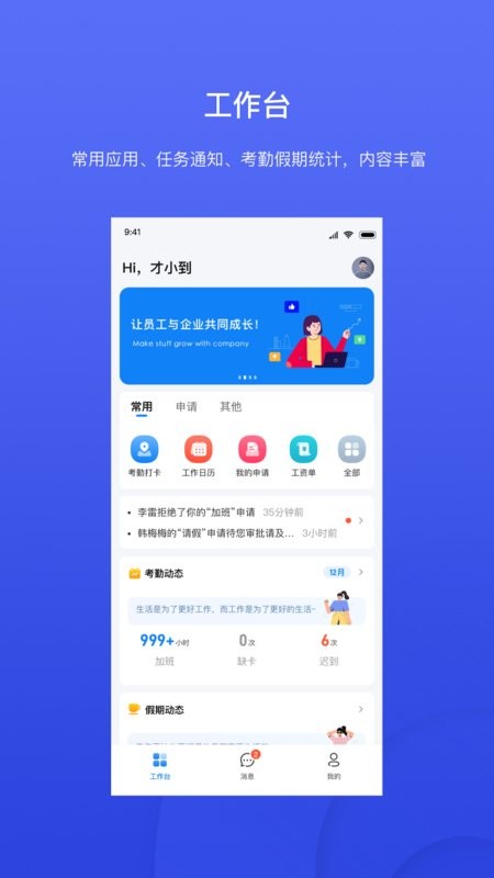 才到云app是一款为企业公司员工打造的移动办公管理平台,打造掌上工作台,支持考勤打卡、工作日历、我的申请、工资单等功能服务,实时记录历史,推送最新消息,掌握最新动态,任务通知、审批、考勤假期统计一手掌握,更有员工关怀机制福利可以体验!