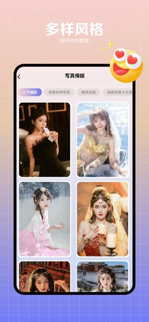 效果逼真,风格多样:热门芭比、韩式写真、美式证件照、童话世界在逃公主等等热门精致写真,等你来拍。