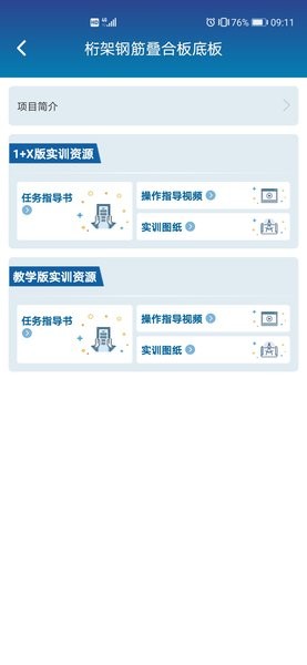 掌上职教云app手机最新版能在手机上查找自己想要的学习资源,包括了课程、图纸、图集等,能够查看详细的实训项目进度,有非常贴心的项目任务指导书、相关的视频以及实训的图纸,让用户可以便捷的完成项目。