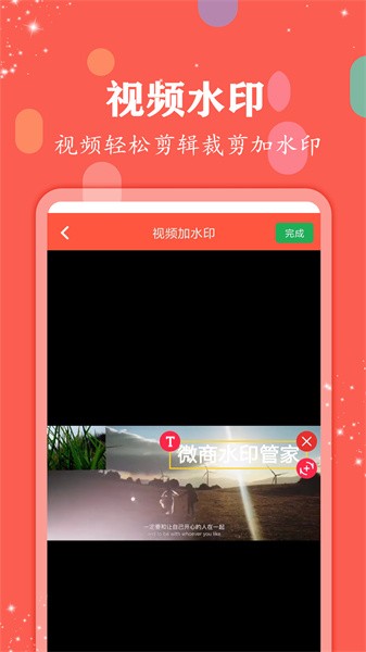 - 添加水印:图片加水印、视频加水印,视频加音乐,制作MV特效,以及加滤镜;