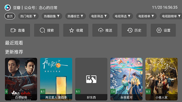 念心影视电视端即念心tv,是电视版的影视追剧平台,聚合各大视频网站,内置海量影视资源,想看的一键搜索直达,自由选择观看,播放稳定流畅,及时更新,每日精选推荐,在线收藏,还可以观看直播,灵活设置管理,带来不错观影体验!
