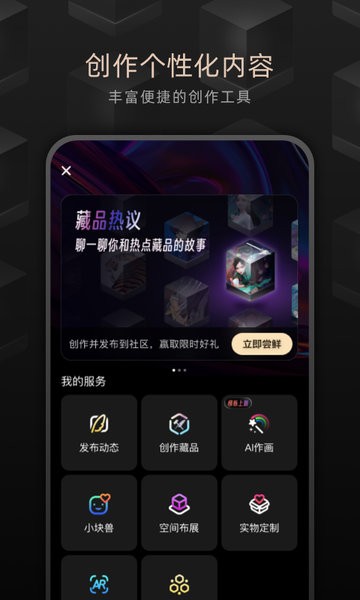 用户可以创作属于自己的数字藏品,通过AI作画工具输入文字或图片生成个性化的数字作品。