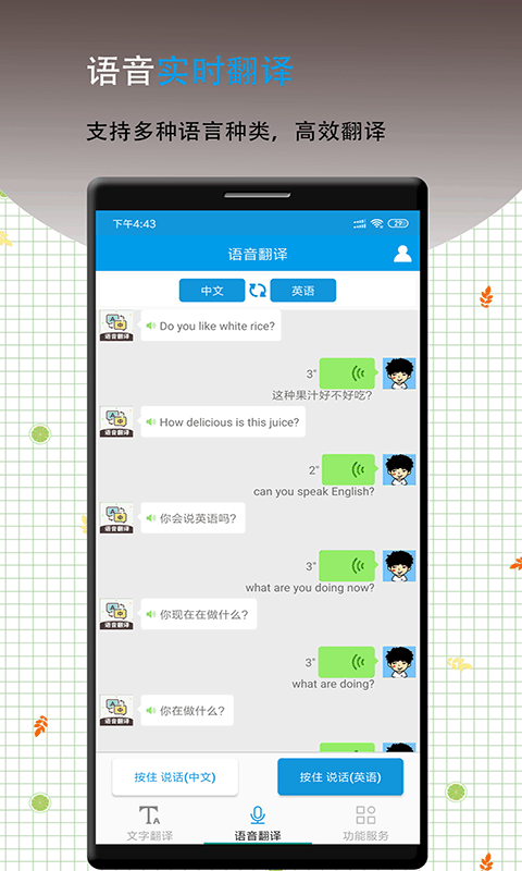 4、支持语音对话翻译,简单实用,中英日泰等源语言语音输入。