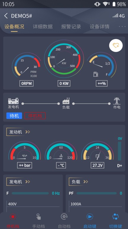 gscloud发电机云控app能够在手机上控制发电机设备,可以查看设备概况,运行的状态,详细的数据信息等,还能查看所有的报警记录,能用手机控制启动键、自动挡手动挡等,可以控制多个发动机,数据展示非常之清晰。