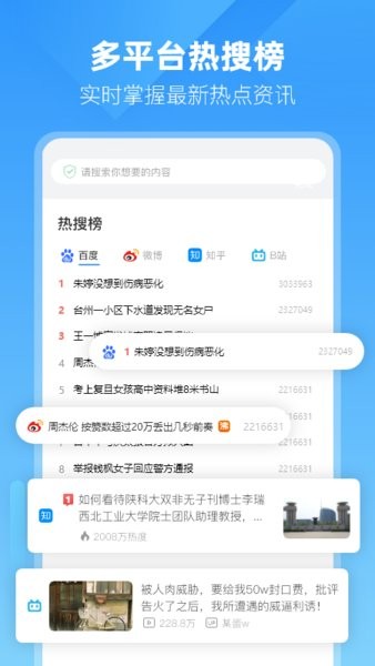 用一个浏览器便能刷尽百度、微博、知乎、bilibili、抖音多平台热搜,跟随各大平台实时更新,快速掌握实时动态,让你足不出户知天下事。