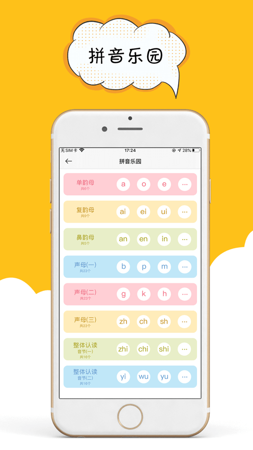 还有简单的拼音乐园内容,里面划分单韵母、复韵母以及声母等多种拼音列表;