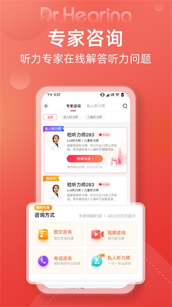 专家咨询:用户选择听力师经进行图文\\电话\\视频进行咨询,也可购买私人听力师服务