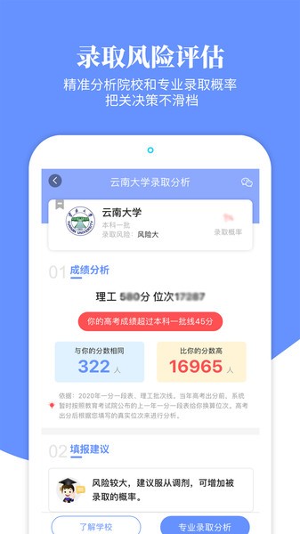 高考志愿填报工具依托全量招生录取数据、大学和专业特征数据,利用智能算法和机器学习精准定位院校和专业,规避掉档风险,发挥分数更大价值!