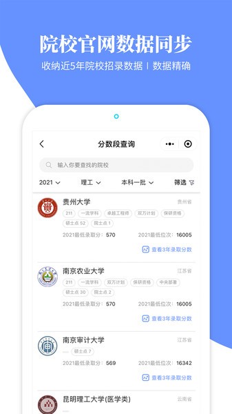 育腾高考志愿官方版是专门为高考毕业生提供志愿填报指导服务的应用软件,提供高考数据信息查询,一键搜索直达,院校官网数据同步、精确,查看方便,还支持ai智能推荐,提供录取风险评估为你把关决策,帮你科学填报,择校择业,好用又实用。