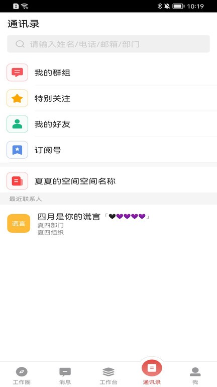 提供公司内部的通讯录架构,用户可直接使用软件与员工发起联系;