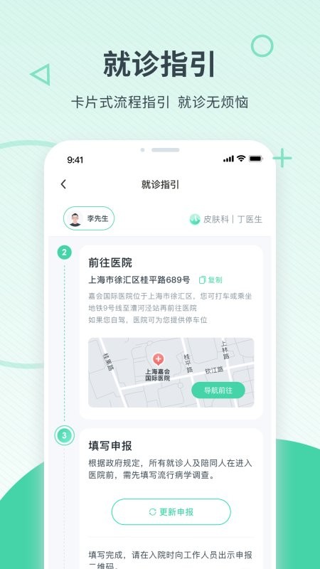 为用户提供就诊指引,卡片式任务,流程清晰,操作便捷;