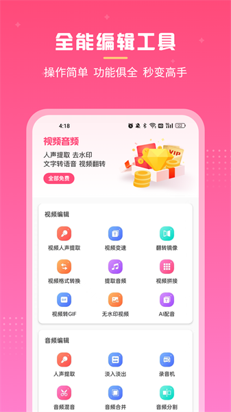 视频音频人声提取是一款支持视频翻转镜像、视频变速、音频提取、格式转换、音频合并分割、人声提取、音频倒放、录音等功能的编辑软件。