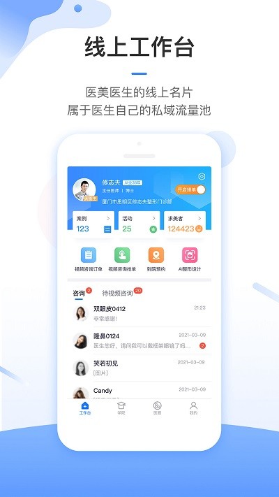 医生线上工作台。运用先进的3D模拟整形系统,一对一为求美者提供图文、视频咨询服务。