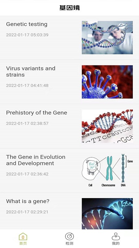 基因镜,好用的基因检测软件,运行时需完成蓝牙配对,可随时随地借助荧光检测基因镜完成基因检测,软件包含丰富的基因科学方面资讯与知识内容,软件启动快速,功能完善,检测不限次数要求,使用十分方便,有需要的用户可以下载使用!
