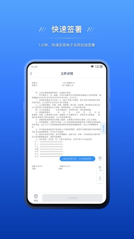 最让我觉得方便的是移动签署功能,出差在外也能随时处理合同事务。而且,平台上还有一键式操作,从发起到签署整个流程只需要一分钟,省时又省力。