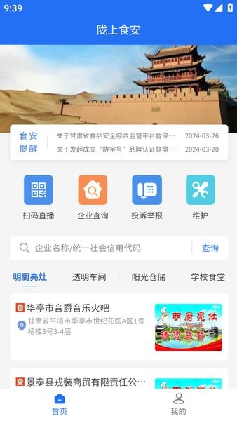 甘肃陇上食安餐饮服务app手机客户端最新版本(电子追溯平台)全称陇上食安一体化食品安全智慧监管平台,即为甘肃明厨亮灶公众平台。大家在这里可以随时查看学校食堂、附近餐厅的后厨情况,店铺相关信息、营业资格证、食材车间等等一目了然,如果发现有食品不卫生的情况可以直接在平台上举报投诉,共同发力打造更加安全的饮食环境。