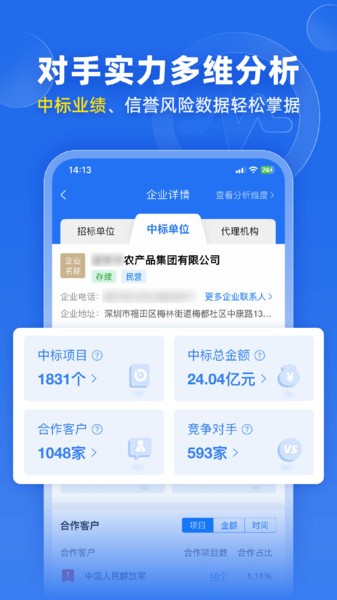 比地招标官方版是有标讯快车app升级改名而来的一款招标采购信息平台,每日更新,覆盖各地城市,大量招标采购信息可以查看,轻松查询查找项目、企业、了解企业报告、行业报告内容,对手实力多维度分析,风险一手掌握,全流程管理投标项目!