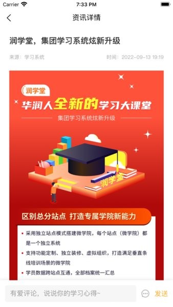 润学堂,华润人自己的移动学习平台。平台拥有丰富的学习课程,可以学习和互动,还拥有诸多赛事活动,是员工学习岗位知识,提升专业技能的重要工具。