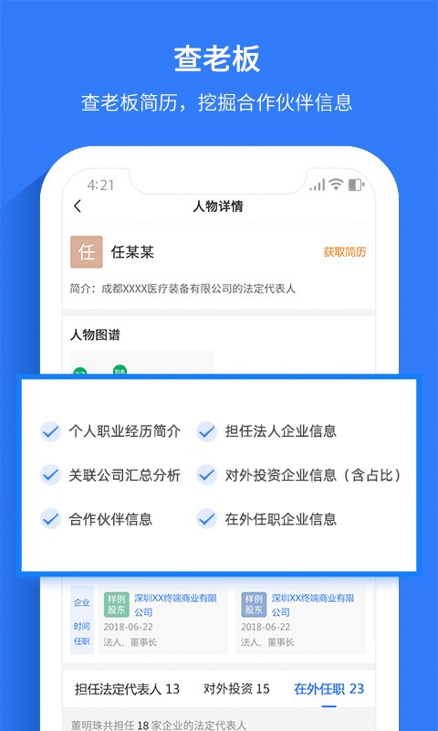 2、老板背景:老板商业角色、所有企业、合作伙伴、风险扫描