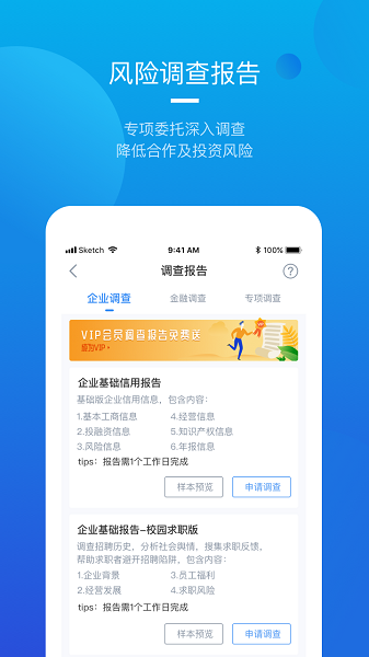根据企业全维度信息,提供专项委托调查服务(共有十大类型调查报告),帮助商务人员与投资者深入了解企业项目信息与经营状况,防范金融诈骗,有效降低商务合作与投资风险;