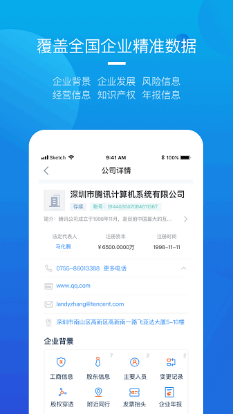 1、企业背景:工商信息、股东信息、懂事监事人员信息、企业变更记录、股权穿透图、附近同行企业信息、发票信息、地址、联系电话;