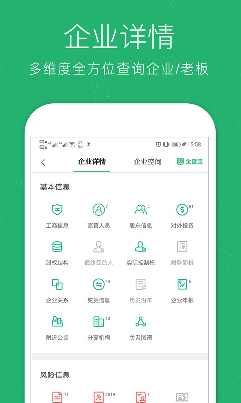 企业查询宝是一款可以快速查询企业和企业老板工商背景信息的强大企业查询工具。覆盖全国1.6亿+企业信息,为用户提供全面有效的企业大数据查询。只要输入需要检索的企业名或人名,就可快速查到企业的工商信息、联系方式、股东高管、股权结构、对外投资、商标专利、司法诉讼、信用状况、关系图谱、发票查询、变更状况、招聘信息、行政处罚等。