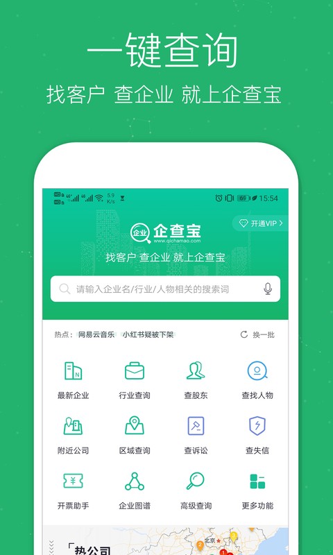 支持企业名或人名等关键字的智能搜索,可一键查企业、查老板。