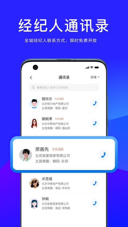 全城写字楼经纪人联系方式持续更新,限时免费开放;还可以根据业务类型、区域定位进行精确筛选,与经纪人共同协作,高效完成选址交易。