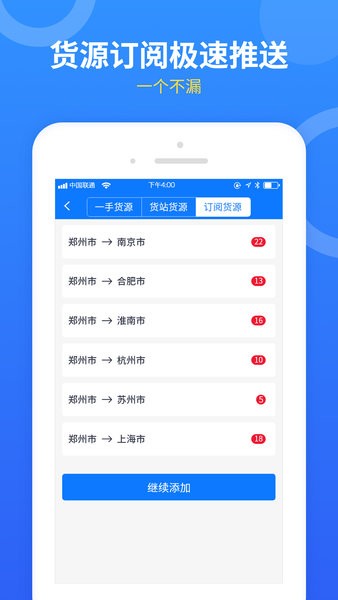 订阅货源:提前预定返程货源、回头货源,发货客户实时推送一个不漏,有效降低回头车空载率;