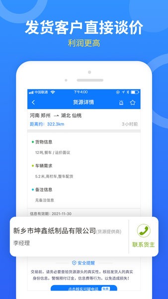 1、拥有电话联系功能,用户能够在应用中快速的联系货源的主人,询问各种问题;