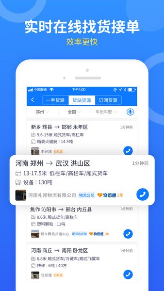 发布车源:添加车辆、发布车源、设置常跑路线,让发货企业更容易找到您;