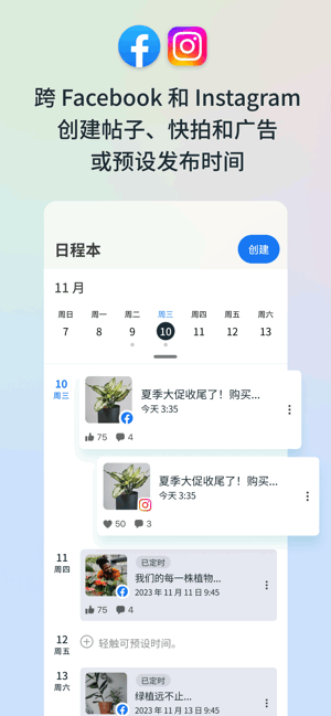--跨Facebook和Instagram创建帖子、快拍和广告或预设发布时间