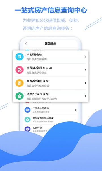 4、便民查询:房屋备案状态查询、商品房合同查询、存量房合同查询、户型图查询、预售查询、现售查询、一房一价查询、存量房预约受理查询。