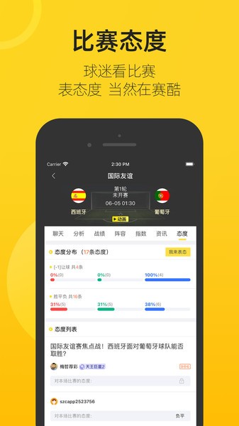 赛酷体育是一款足球赛事新闻服务平台,它汇集了所有的赛事数据、赛事资讯,每天都有新的看点、热点上新,用户可以参与圈子讨论区与球友交流探讨,同时赛场上的解说员实时分析赛事数据。