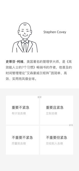 它是由着名的管理大师,畅销书《成功人士的7个习惯》的作者史蒂芬・柯维(stephen covey)提出的一个时间管理理论。该理论最重要的内容就是把事情按照重要和紧急程度划分为四个象限:重要而且紧急、重要但不紧急、不重要但紧急、不重要而且不紧急。