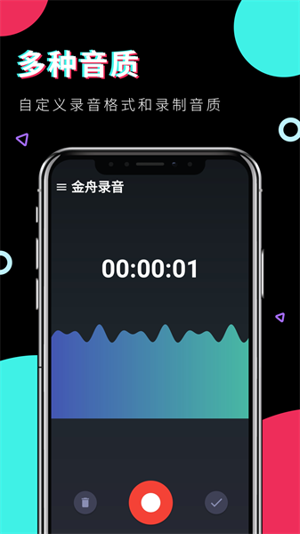金舟录音大师软件是一款提供高质量录音的手机软件,提供播放、存储录音等一系列功能,界面清晰简洁,功能强大易用,同时还提供wac、aac录音格式选择,多钟播放方式,变速播放等,可一键分享录音。