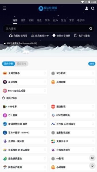 爱达杂货铺影视软件(视频电视剧在线观看免费完整版)(爱达导航)是爱达杂货铺网站入口https://adzhp.com/网址的手机客户端,一款很牛掰的资源搜索神器!软件可以找到很多内容,包括影视、网盘、软件、图片等,聚合超多不同类型的资源,欢迎大家来体验。
