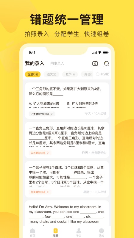 老师拍照即可为学生录入错题,并自动为每个学生生成错题本;