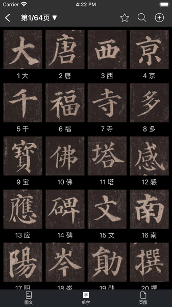 书法字典大全是一款专为书法爱好者设计的手机软件,里面收录了三十万历代名家的书法作品,涵盖篆书、隶书、楷书、行书、草书等多种字体。软件里的书法作品都是高清原帖,没有经过任何加工,非常真实。特别是矢量格式的书法字,放大三倍也不会失真,超级清晰。