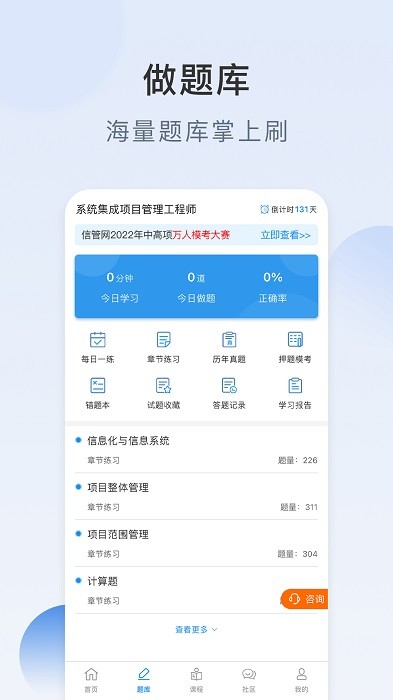 信管网app软考培训是一个很不错的备考工具,主要为软考相关考试提供全面的学习服务。作为移动端学习系统,它整合了课程、做题、干货等多种功能,特别是根据用户的做题情况给出科学评估这一点挺实用的,能帮助用户有针对性地提升弱项。