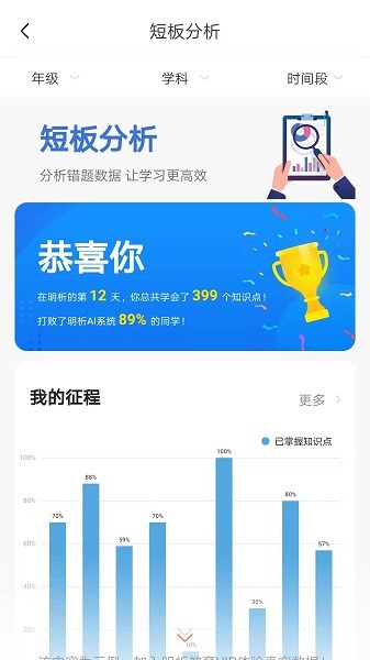 明析教育,一款针对初高中生的高效学习软件。以收集学生日常学习中的错题、难题为主要方式,通过大数据+ai人工智能算法,精准定位初高中生知识点短板。学生根据短板分析报告有针对性的学习,学习完成后,通过“讲给老师听”功能可彻底掌握薄弱知识点。
