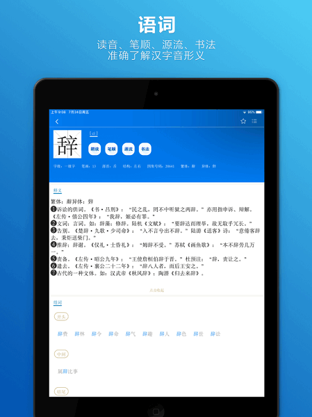 辞海hd app是一款为安卓平板设计的权威词典工具,内容丰富,功能强大。它同步了纸质版《辞海》的全部信息,包括13万词条和2350万字,查词方便快捷,支持直接搜索、拼音、部首等多种方式。app还提供清晰的汉字发音、生词收藏复习、云同步等实用功能,学习百科知识时还能观看相关视频,了解汉字演变和书法艺术。界面设计简洁直观,操作起来毫不费力。最让我觉得惊艳的是它的多媒体资源,比如音视频和3d模型,让学习更生动有趣。对于语言学习者来说,这款app真是个宝藏,不仅能查词,还能通过知识导图建立关联,随时复习生词。再加上专业的运营团队及时更新内容,用户体验非常棒。总之,辞海hd app绝对是一款值得拥有的学习工具!