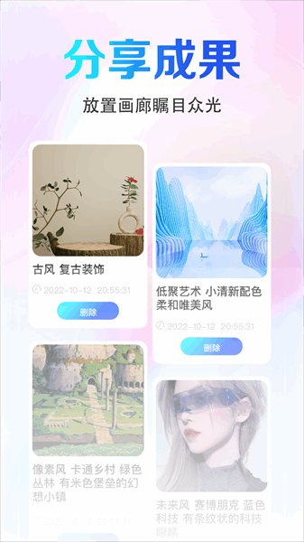 Ai画图app,使用人工智能AI艺术生成技术,输入词汇后,选择一种艺术风格,您将会看见您的想法变为现实并在几秒钟内生成伟大的艺术作品。