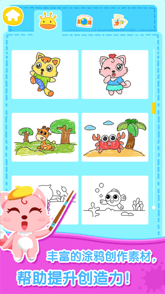 独特的画板涂色功能,让小朋友们自由选择自己喜欢的图案进行创意填色。