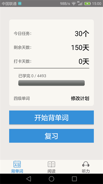 2、背单词:背诵四千多个英语四级高频单词,设定每天背诵单词的任务,背完打卡;
